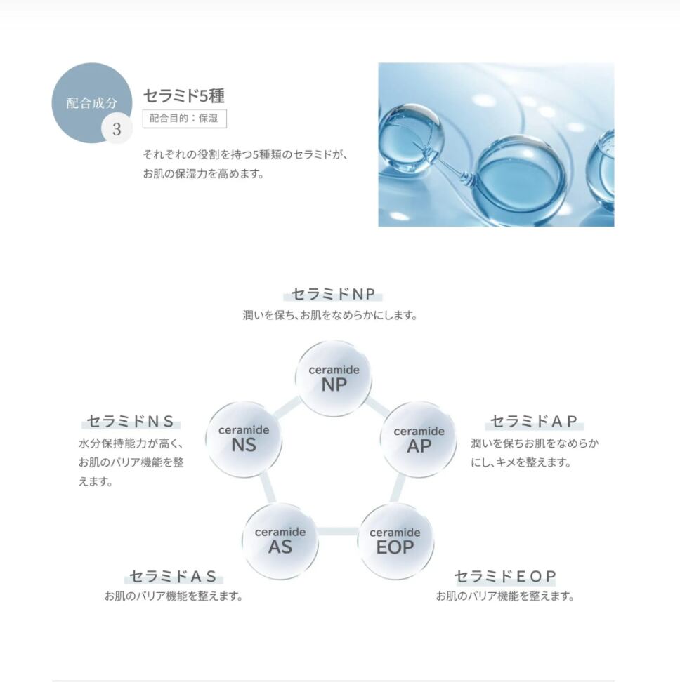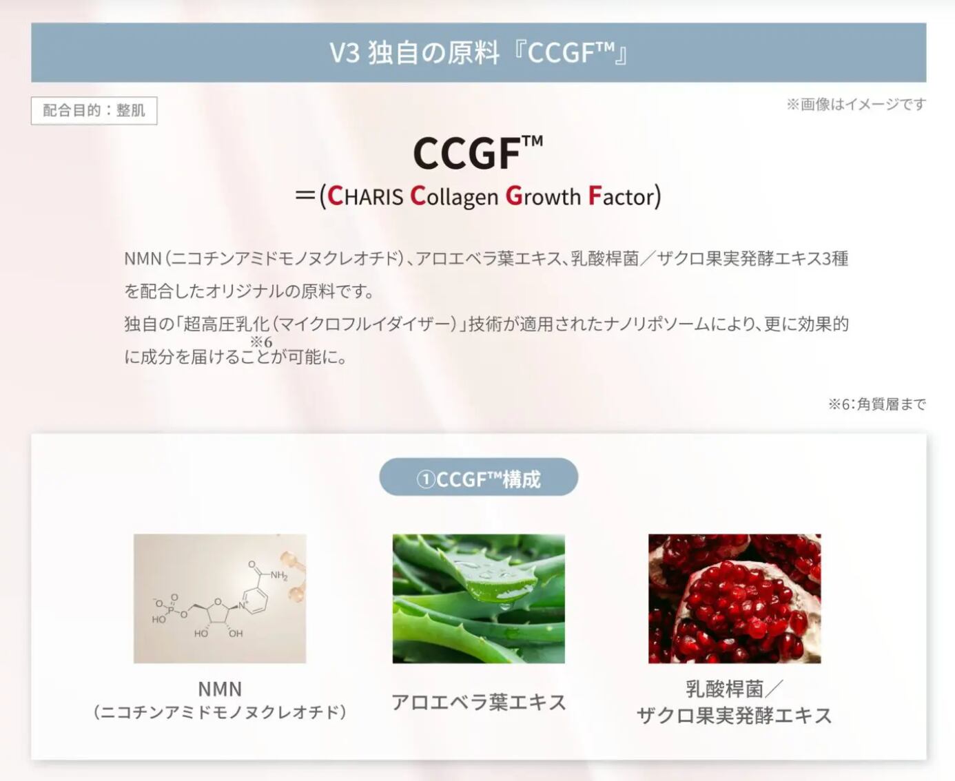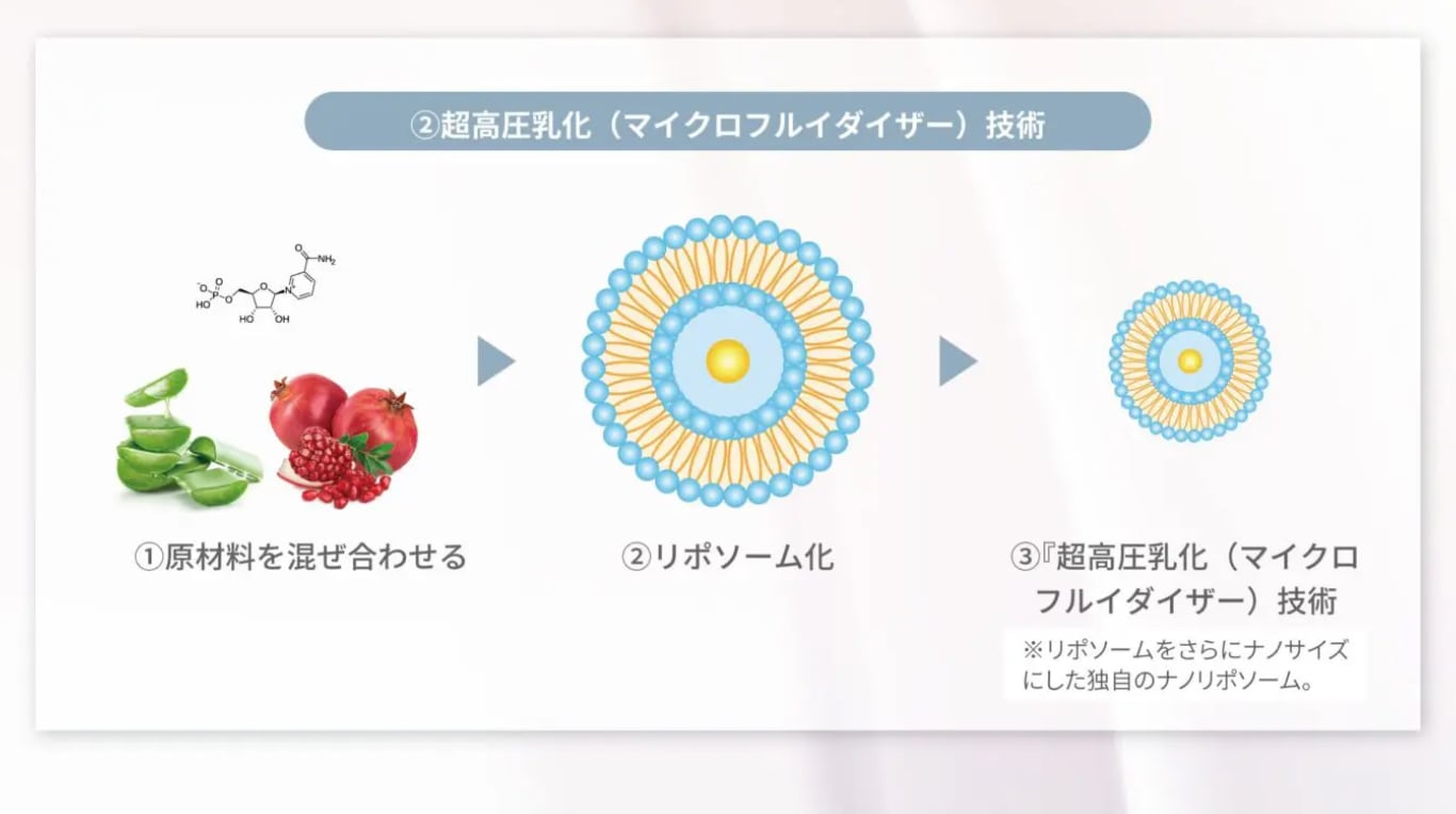 ※1:NMN(ニコチンアミドモノヌクレオチド)、アロエベラ葉エキス、乳酸桿菌/ザクロ果実発酵エキス(整肌)