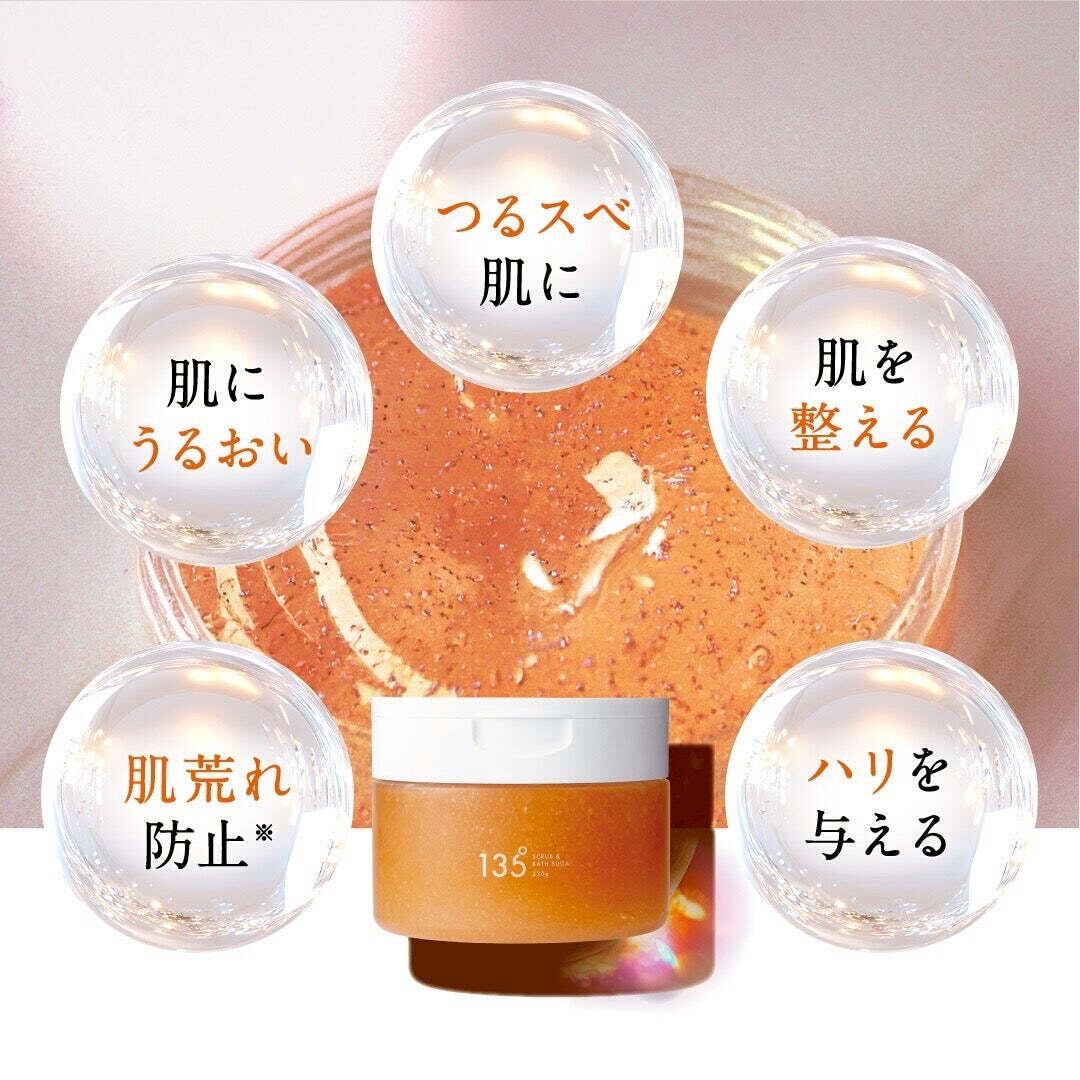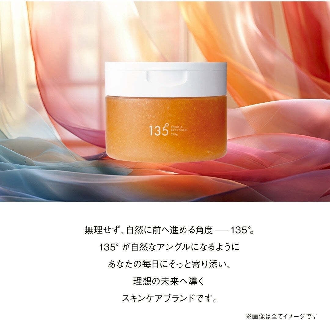 また、135°(イチサンゴーマル)は、パームヤシ油・ヤシ油由来のグリセリンをたっぷり配合した100%植物性処方。肌にやさしくなじみ、とろけるように密着することで、マッサージ中にじんわりとした温かさを感じさせてくれます。さらに、やわらかい粒感のスクラブが肌をなでることで生まれる“熱”も加わり、ケアタイムにぬくもりをプラス。まるで手のひらで温められているような、肌も心もほぐれる心地よさ。洗い上がりはつっぱらず、しっとり柔らかな肌に仕上がります。