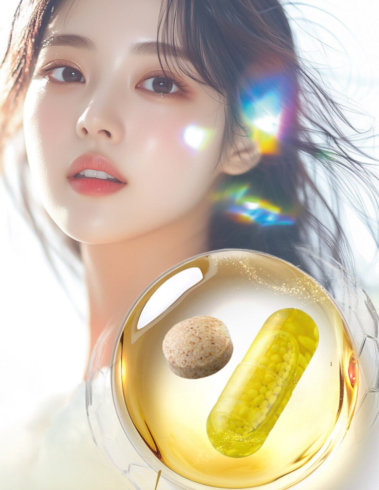 美容オイルカプセルには、1回の摂取で長時間の吸収が可能な「タイムリリースビタミンC」と、美容オイル※1を独自技術で閉じ込めています。錠剤には、若々しさとうるおいキープが期待できるシステインペプチドと、ビタミンCの吸収をサポートする黒コショウエキスや40~50代の女性をサポートするマカを配合。