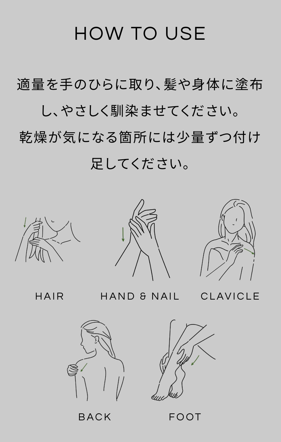 ※量の目安は、長さ:ミディアム、髪の太さ:普通の方を対象にしています。髪の長さ、量、オイルの重さで使用量を調整してください。