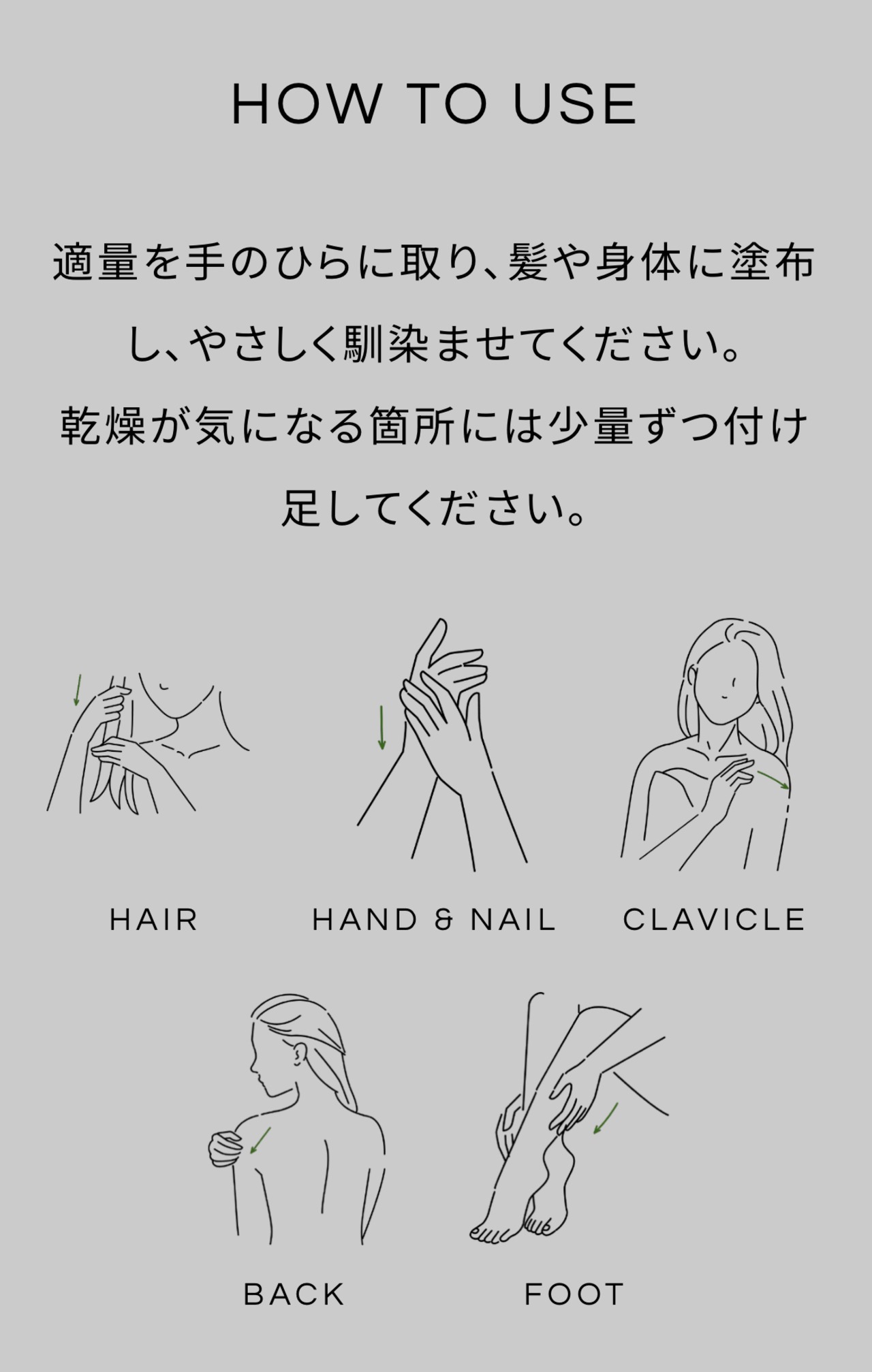 オイルは全身用で、髪、身体にお使いいただけます